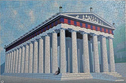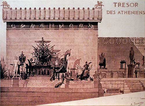 Das Schatzhaus der Athener: Zwei Ansichten und eine Rekonstruktionszeichnung, wie man sich die Präsentation der Schätze vorstellt