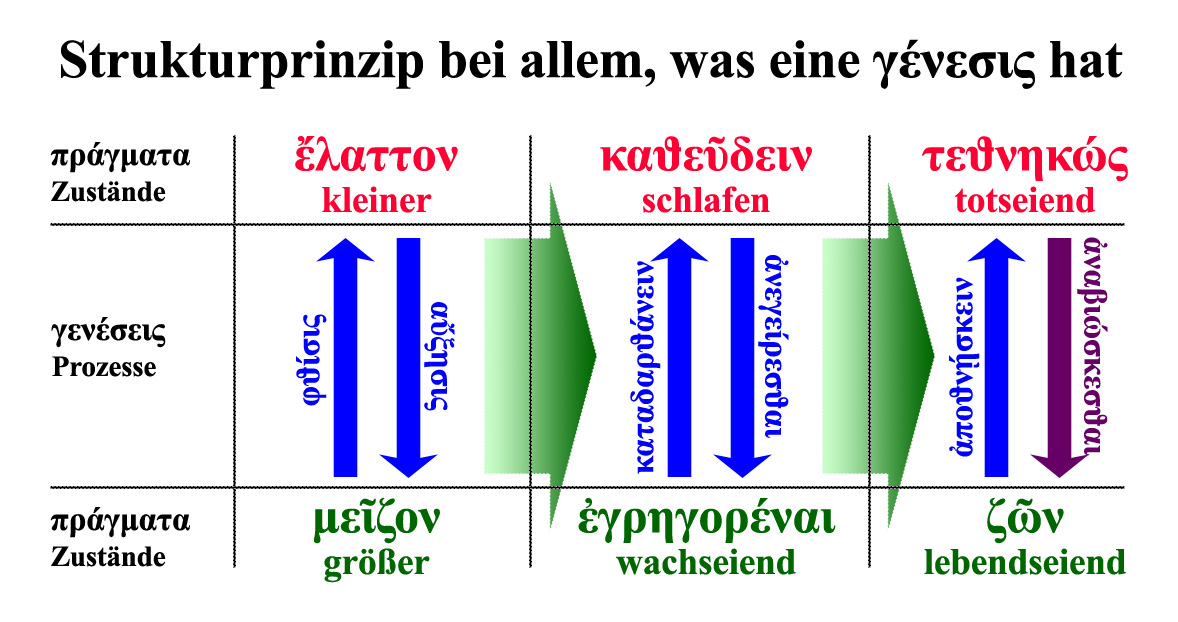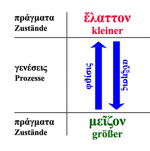 Beim Größeren und Kleineren heißen sie Vermehrung (αὔξησις, αὐξάνεσθαι) und Schwinden/Vergehen (φθίσις, φθίνειν).